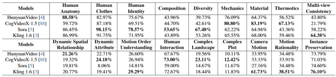 VBench-2.0 不仅可以对现有模型进行评测,更重要的是,还可以发现不同模型中可能存在的各种问题,为下一代视频生成模型的发展提供有价值的洞见。