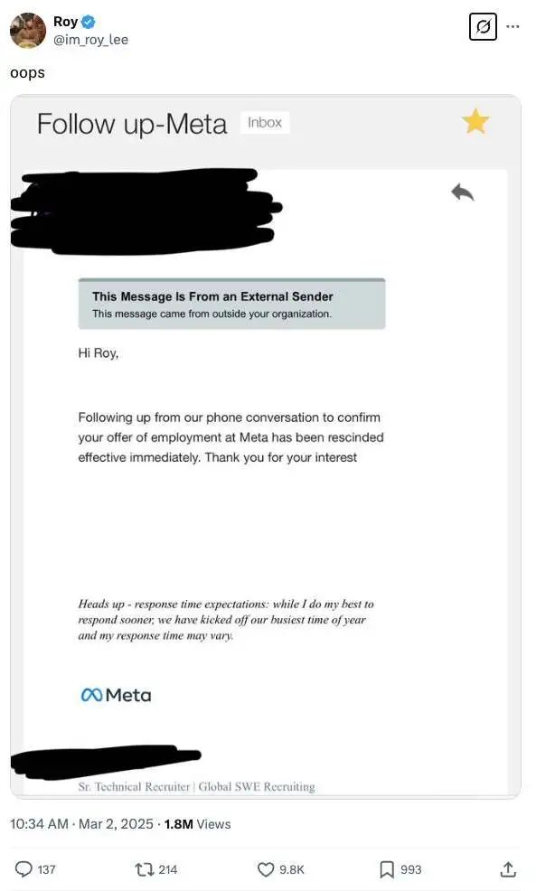 随后,他又分享了一张据称来自 Meta 的电子邮件截图,内容是撤销实习录用通知。“嗨,Roy。跟进我们之前的电话沟通,确认您在 Meta 的录用通知已立即撤销。感谢您对此的兴趣。”邮件内容如此写道。