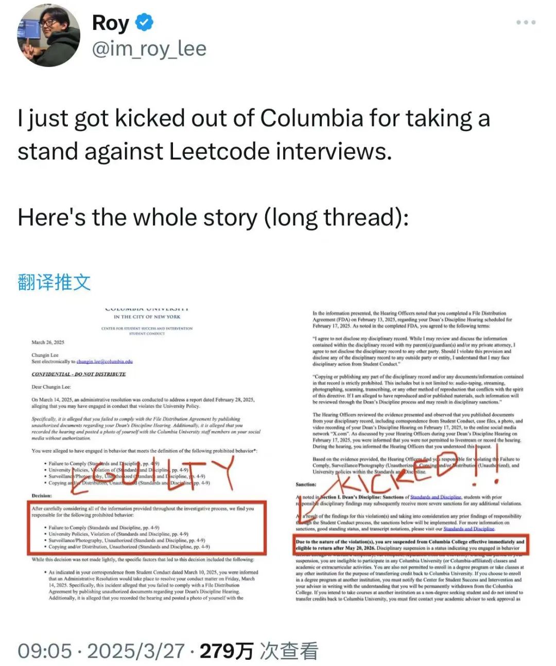 可想而知,这样的行为很快引起了争议。视频上传两天并被广泛传播之后,哥伦比亚大学收到了一封匿名信,指控这位名为 Chungin “Roy”Lee 的 21 岁学生在面试中作弊。直到校方将删减版的信件转发给他,并通知他将于 3 月 11 日举行纪律听证会时,Lee 才得知自己被投诉。