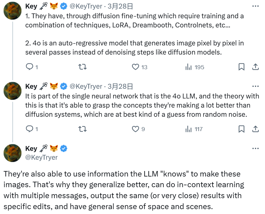 开发者 @KeyTryer 也给出了自己的猜想。他说 4o 是一种自回归模型,通过多次通过来逐像素地生成图像,而不是像扩散模型那样执行去噪步骤。