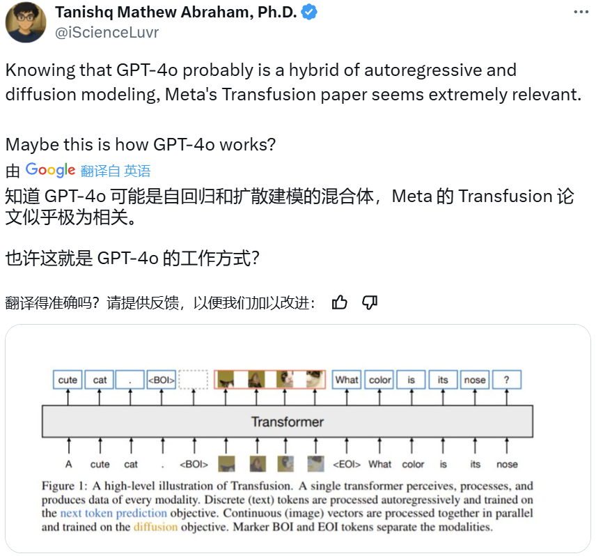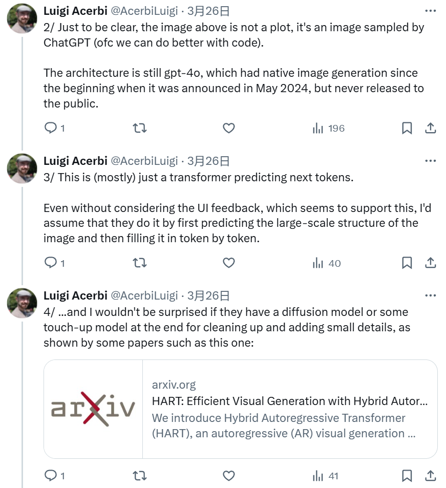 芬兰赫尔辛基的大学副教授 Luigi Acerbi 也指出,GPT-4o 基本就只是使用 Transformer 来预测下一个 token,并且其原生图像生成能力一开始就有,只是一直以来都没有公开发布。
