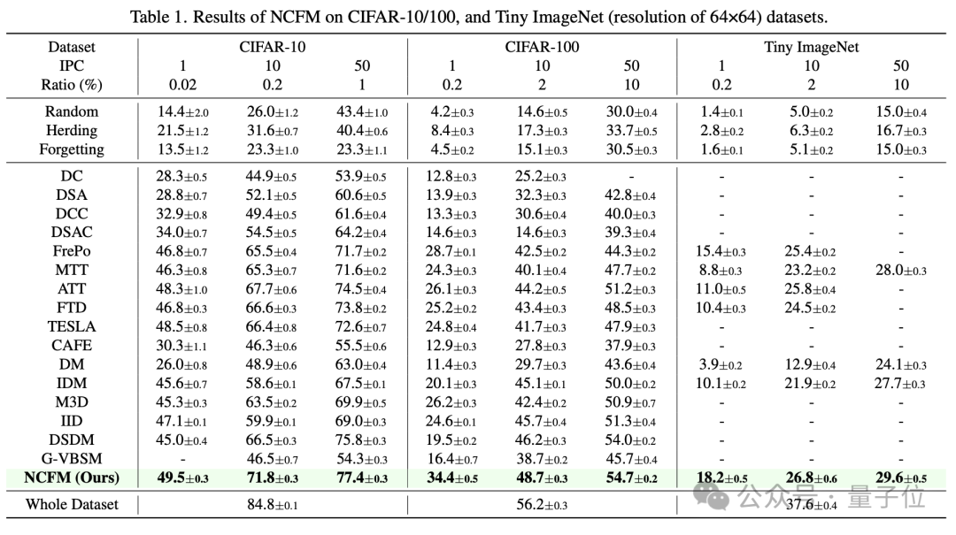 在CIFAR-10、CIFAR-100、等数据集中上,NCFM在每类1/10/50张图片的情况下的测试精度均超过了所有baseline方法。