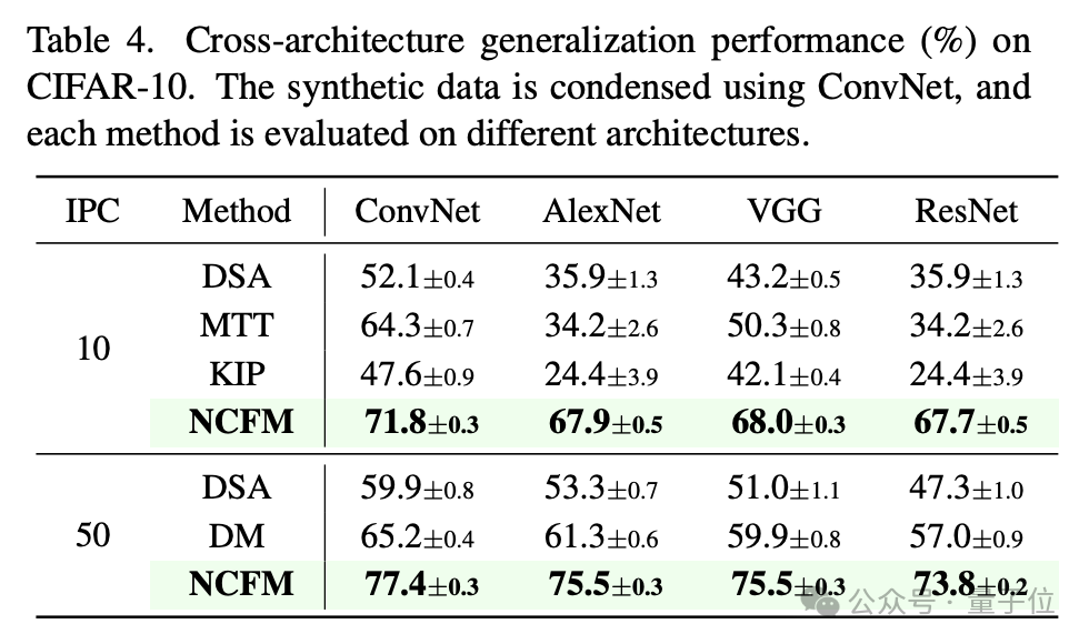 此外,NCFM生成的合成数据在跨模型泛化能力上超过了现有方法。
