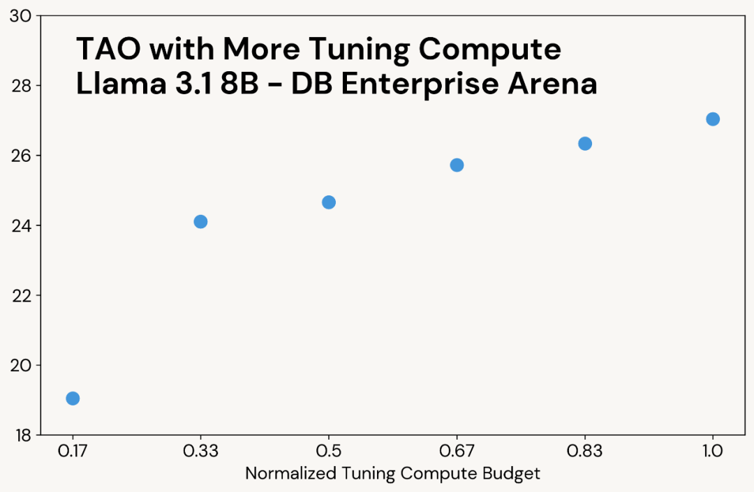 增加 TAO 训练阶段的算力投入,可以在相同数据条件下获得更优模型质量,且不会增加推理阶段的成本消耗。
