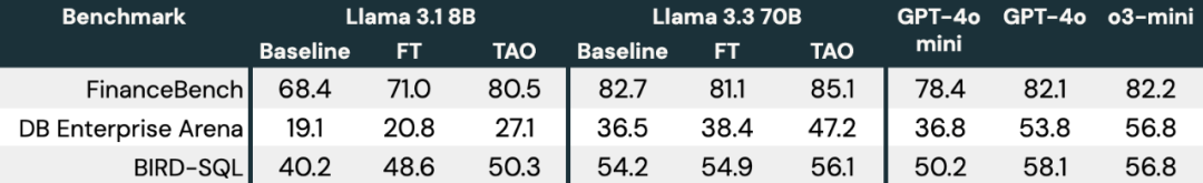 表 3:在三个企业级基准测试中使用 TAO 的 Llama 3.1 8B 和 Llama 3.3 70B 实验结果。