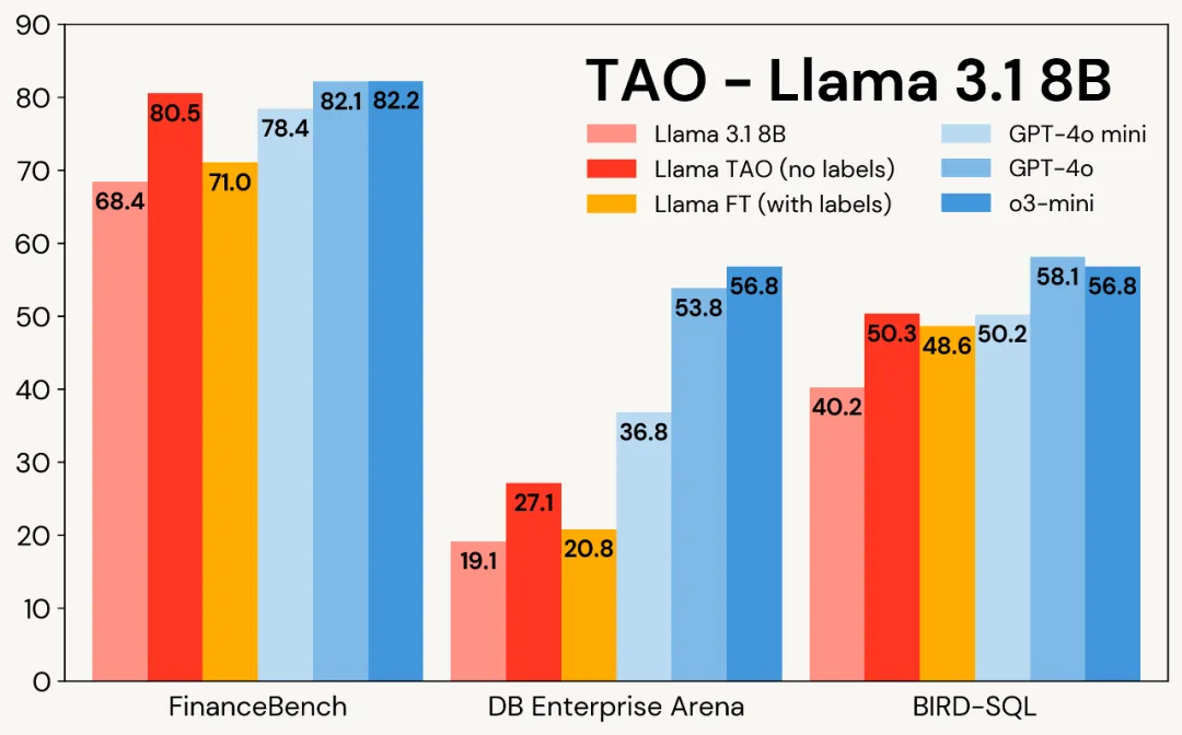 在文档问答和 SQL 生成等专业企业任务中,TAO 的表现优于需要数千标注样本的传统微调方法。它让 Llama 8B/70B 等高效开源模型达到了 GPT-4o/o3-mini1 等商业模型的同等水平,且无需任何标注数据;