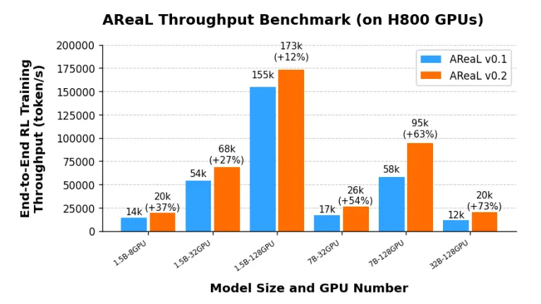 AReaL-boba 是首个全面拥抱 xAI 公司所采用的 SGLang 推理框架的开源训练系统,对比初代 AReaL 训练大幅度提升训练吞吐:通过集成 SGLang 框架及多项工程优化,AReaL-boba 可以无缝适配各种计算资源下的强化学习训练,实现吞吐在 1.5B 模型尺寸上速度提升 35%,在 7B 模型速度提升 60%,32B 模型速度提升 73%。