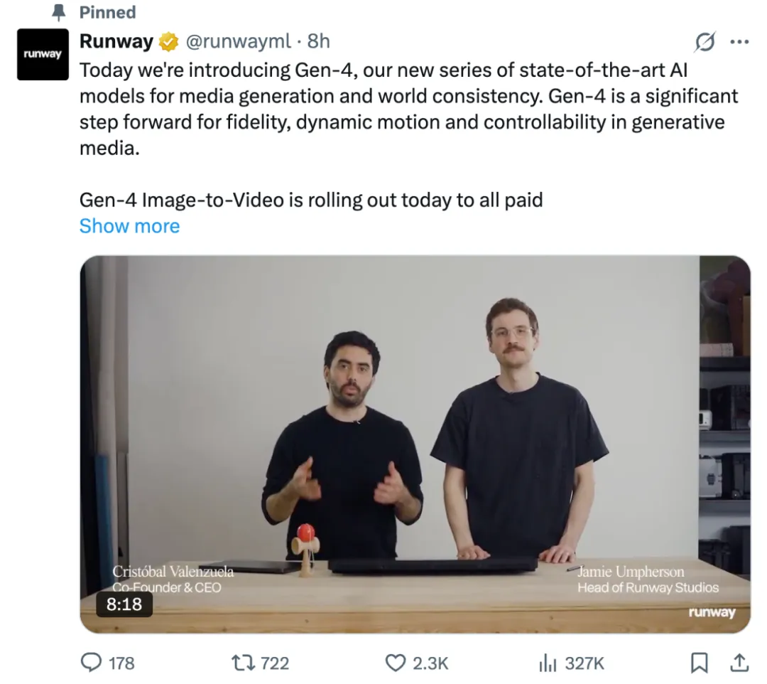 就在昨天,AI 初创公司 Runway 发布了一款号称是迄今为止最高保真度的 AI 视频生成模型 ——Gen-4。