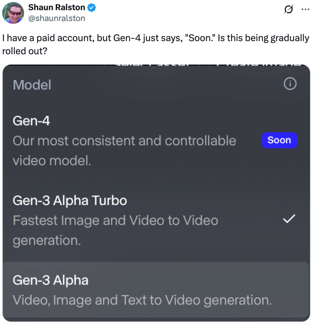 尽管官方声称 Gen-4 图像转视频功能已经向所有付费计划和企业客户推出,但有网友表示,Gen-4 可能正在陆续向付费用户推送,需要耐心等待。