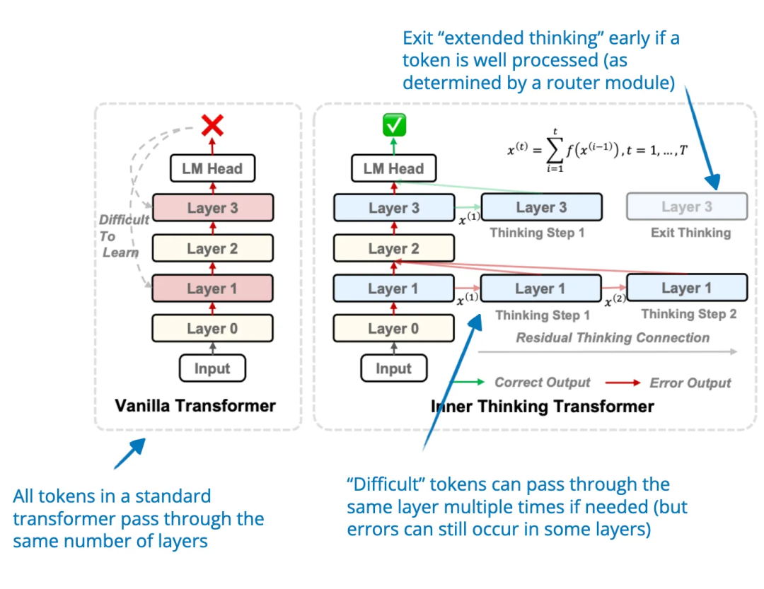 具体而言,ITT 通过自适应路由 token(Adaptive Token Routing)动态分配计算资源,通过残差思考连接迭代地优化表征,让这些困难的 token 多次通过同一层进行额外处理,从而使得 ITT 能够在不增加参数的情况下对关键的 token 进行更深入的处理。