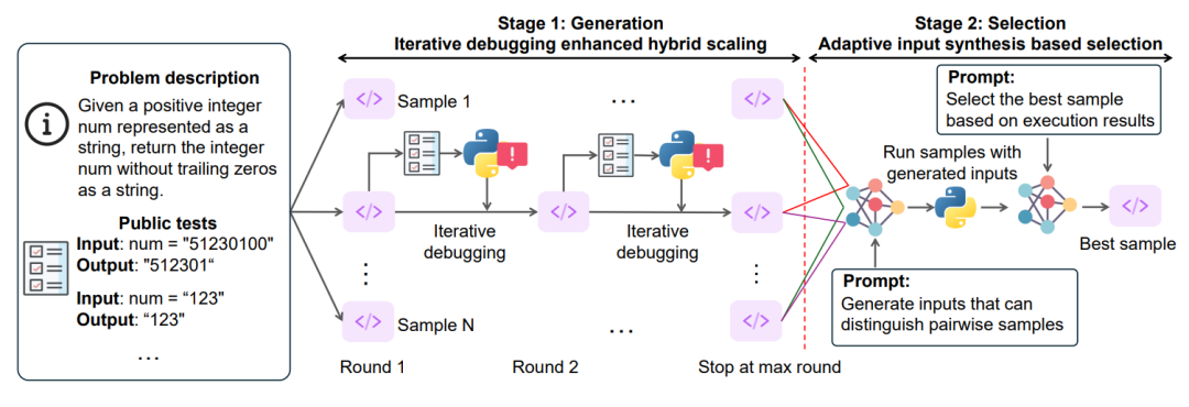 S* 是一个两阶段混合测试时缩放框架,由生成和选择阶段组成,如下图所示。它通过迭代调试扩展并行采样与顺序采样以提高覆盖率,并在选择过程中采用自适应输入合成来增强选择准确性,在整个过程中利用执行结果。不同阶段的效果示例可以在下图中找到。
