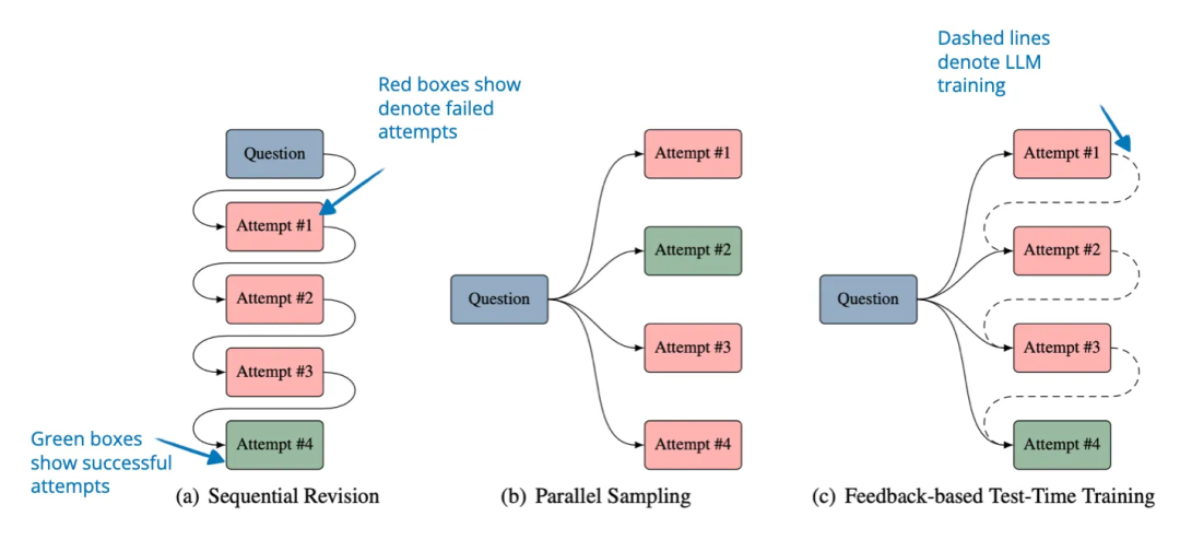 区别于前几种成果的思路,该研究的核心在于通过推理时动态调整大语言模型(LLM)的权重参数,使其能够从错误中学习,而无需将失败的尝试存储在提示(prompt)中,从而避免了高昂的成本。与传统的通过将先前的尝试添加到上下文中进行顺序修正或盲目生成新答案的并行采样不同,该方法在推理时直接更新模型的权重。