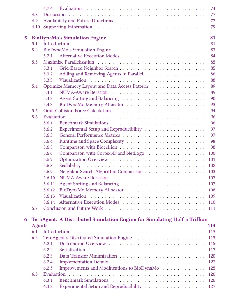 其次,我们通过对基于智能体的仿真进行严格的性能分析,确定了共享内存并行化的三个关键性能挑战,并提出了解决方案。1)为了最大化并行化,我们提出了一种优化的网格来搜索邻居并并行化线程局部结果的合并。2)我们通过非均匀内存访问感知的智能体迭代器、使用空间填充曲线对智能体进行排序以及自定义堆内存分配器来减少内存访问延迟。3)我们提出了一种机制,在某些条件下省略碰撞力计算。我们的解决方案使得性能比现有技术提升了多达三个数量级,并能够在单台服务器上模拟17.2亿个智能体。