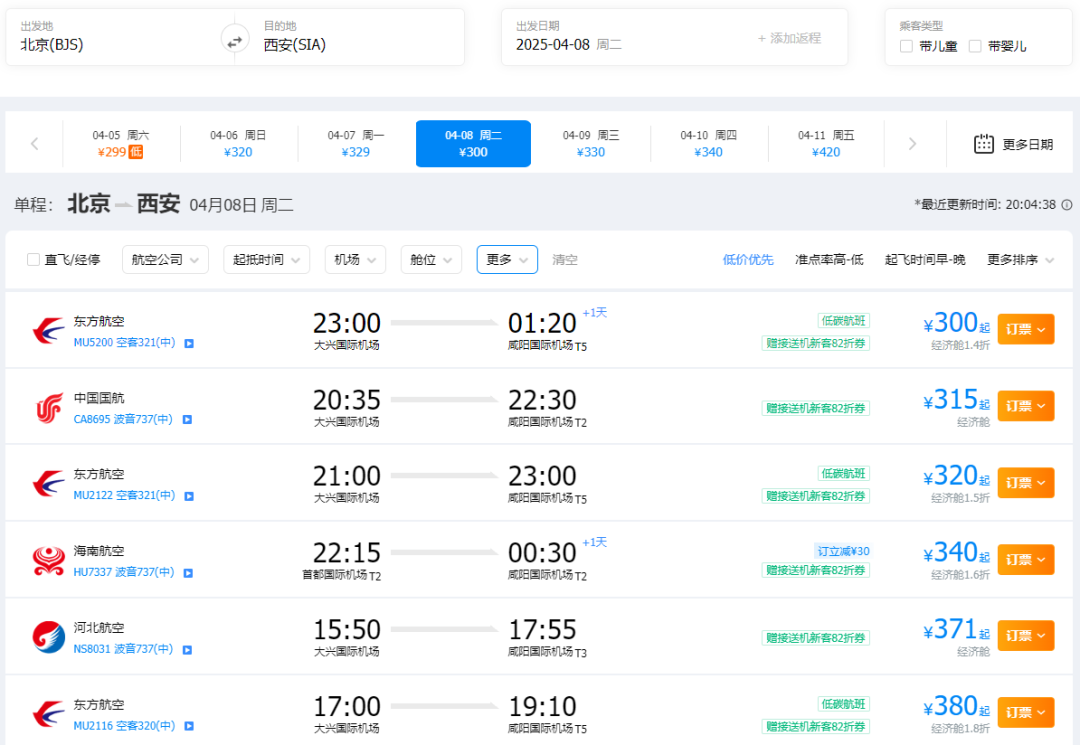 比如北京-长治虽然最低价是200元,但由民营东海航空运行,其他如国航就要300元起: