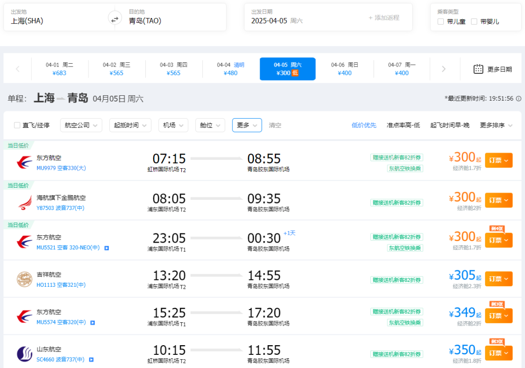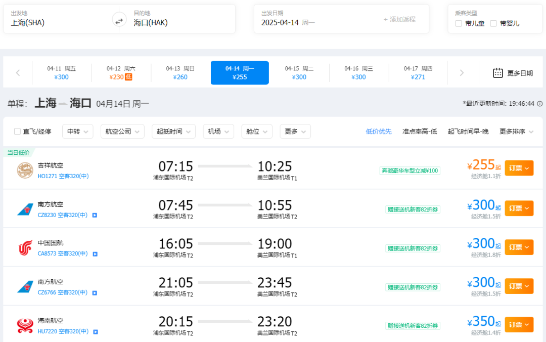 但点进去就能看出,只有民营航司吉祥航空是255元,其他如南航、国航、海航全部300元起: