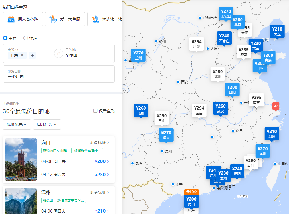 在携程上查询全国特价机票更直观(查询方法请后台回复:特价机票),比如上海出发,看上去都是200出头: