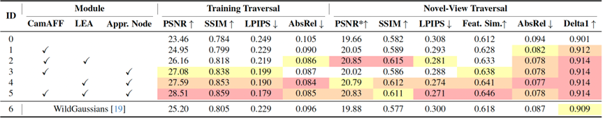 除了多轨迹间的光照差异,同一轨迹内部也存在外观不对齐的情况,如部分相机过度曝光、不同相机间的色调差异。MTGS 创新性地利用激光雷达点云颜色作为 “锚点”,将同一空间点在同一时刻不同相机中的颜色对齐,并为每个相机学习独立的仿射变换,确保不同时刻采集的图片色调统一。