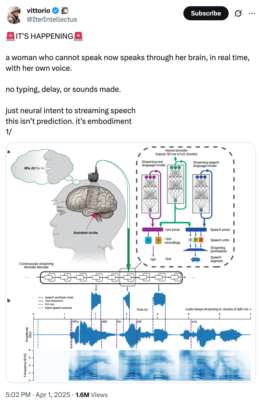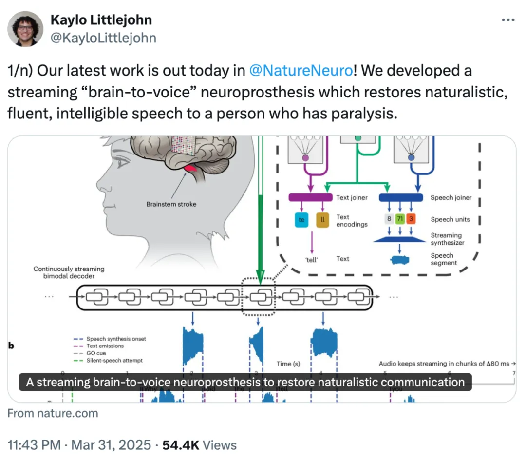 论文一作 Kaylo T. Littlejohn 发推宣传团队的成果,他表示,这种流式「脑转语音」(brain-to-voice)神经假体可以让瘫痪患者恢复自然、流利和清晰的语言能力。