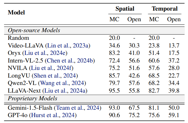 现有模型在时域动态推理方面仍存在不足。模型在时域任务上的性能显著低于在空域任务上的性能。