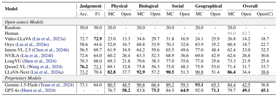 物理规律类视频的理解更具挑战、生物、社会、地理类的视频理解相对容易。
