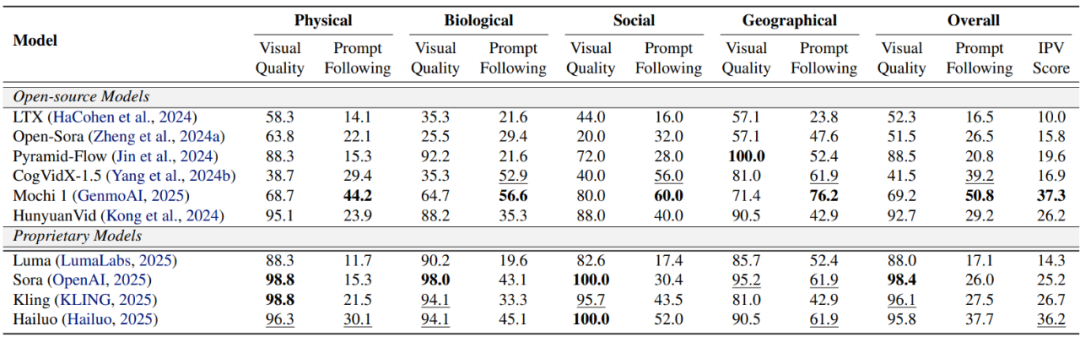 模型在视频质量以及提示遵循两方面能力不均衡。商业模型在视觉质量上遥遥领先,但是难以严格遵循文本提示生成 “不可能” 事件。开源模型如 Mochi 1 视觉质量虽然逊色,但是提示遵循能力远强于闭源模型。