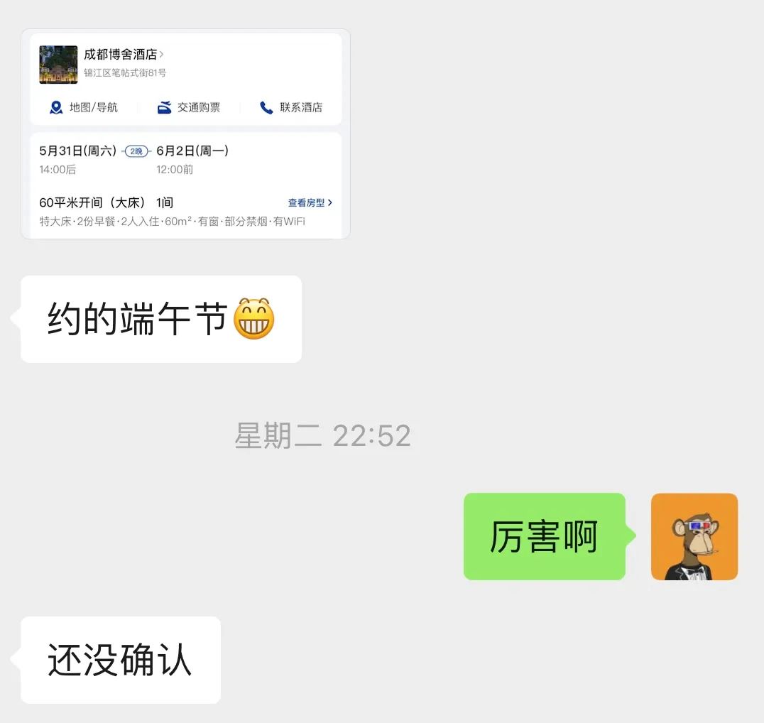 节假日可约的bug第一时间发到群里了,有群友冲了端午节的,但是最新消息,酒店回复无法确认订单。