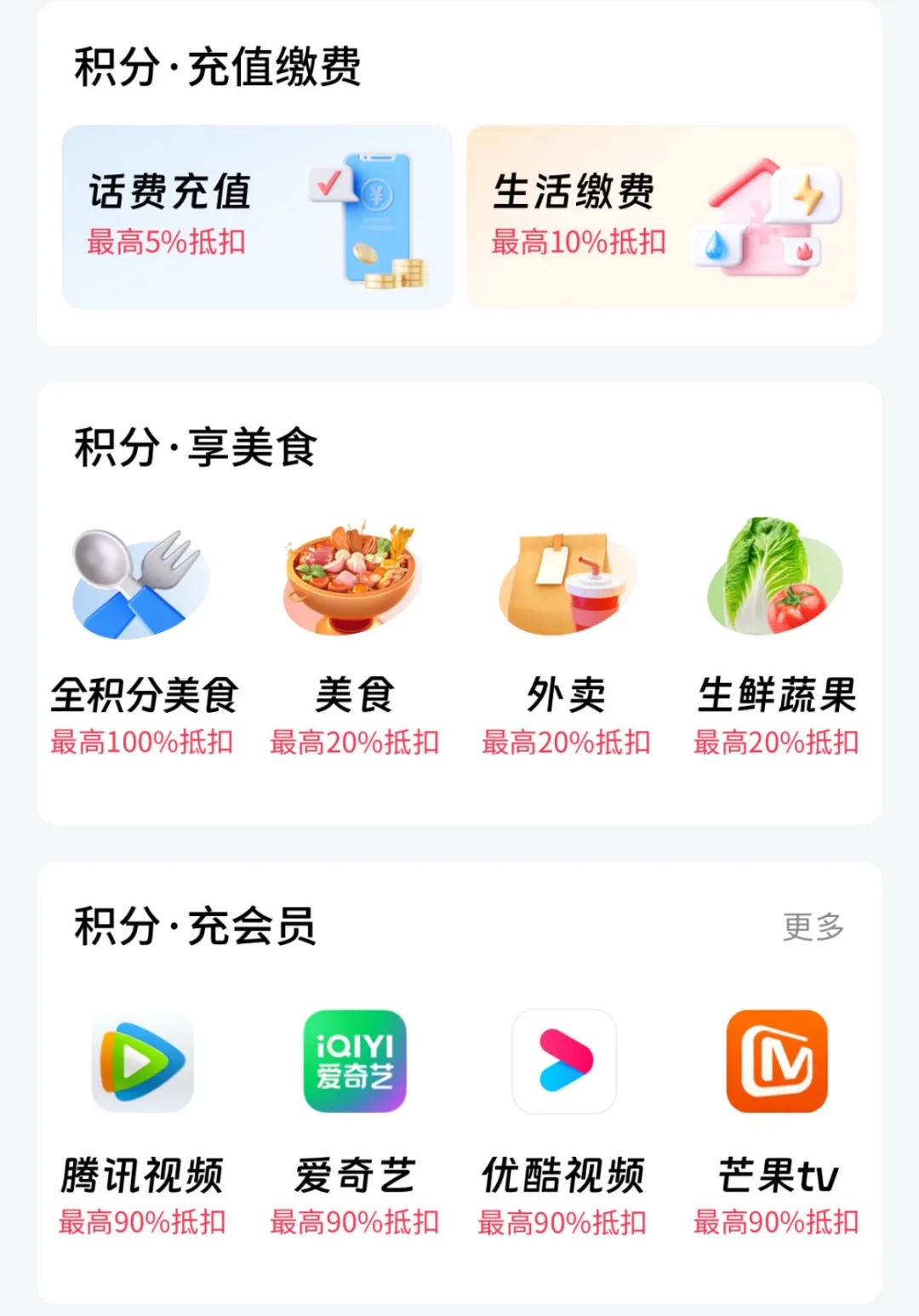 当然,如果你不是大白金客户,或者积分比较多,兑换年费后仍有剩余,那么还有下面这些可以兑换:首先当然是兑换航司里程;此外,在买单吧 App 的积分乐园也有很多不错的小额积分的消耗方式,比如话费和生活缴费、外卖美食、视频会员等等。蓝翼比较常用的是话费、水电费,分别可以抵扣 5% 和 10%。