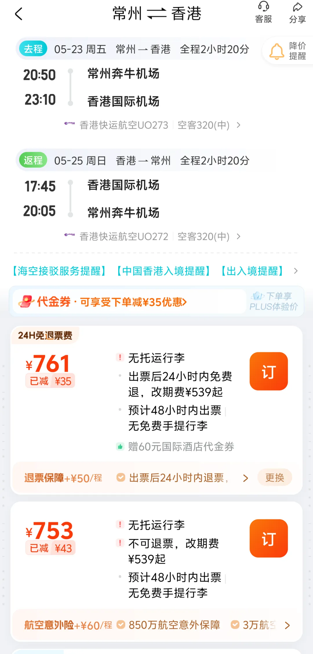 比如常州=香港,5月23日出发,往返含税753元,不含托运行李: