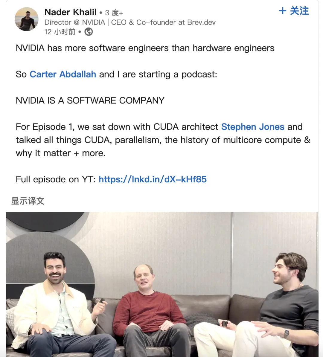 在这场谈话中,Nader、Carter 和 Stephen 深入探讨了英伟达的技术发展、CUDA 的演进以及公司在计算科学和 AI 芯片领域的主导地位。但在他们的谈话,InfoQ 读到了他们透露出来的另一个讯号,也是黄仁勋曾在公开场合反复提到的:英伟达现在是一家以软件为核心的公司。
