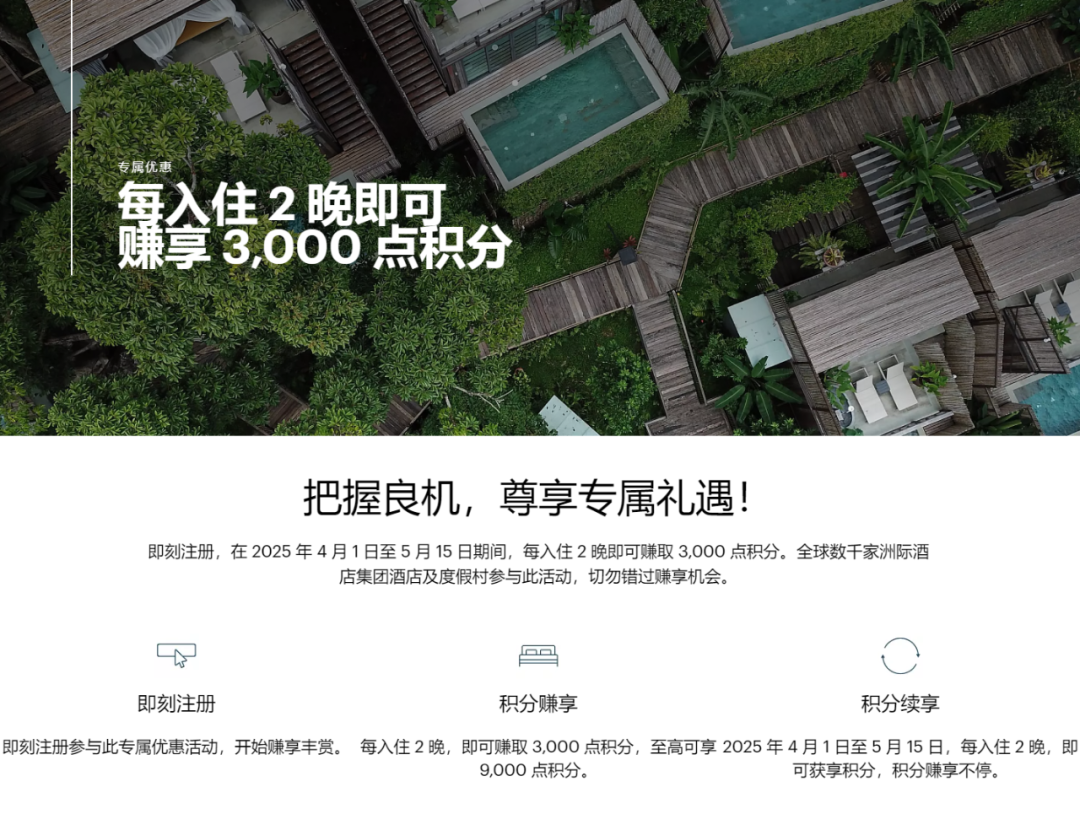 IHG近期活动汇总:双晚送3千积分,快速升级白金卡,新酒店85折兑换,亚太度假酒店65折等。