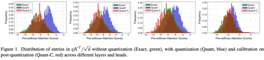 图片如下图所示,校准方法(Quant-C,红色)有效减轻了极端值的影响,使调整后的注意分数分布相较于未经校准的量化方法(Quant,蓝色)更接近全精度(Exact)分布。
