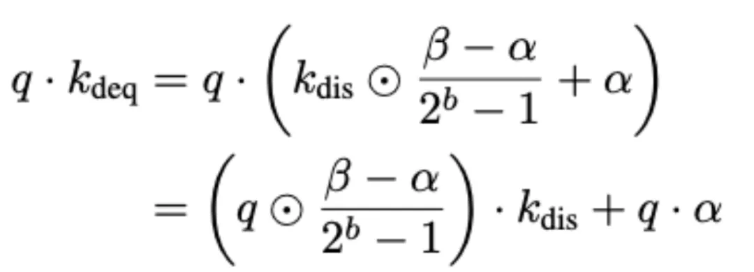 为其进行 b 比特整数量化后的结果,并伴随有逐通道的缩放因子α,β。给定一个查询向量,在生成 token 过程中注意力计算如下:
