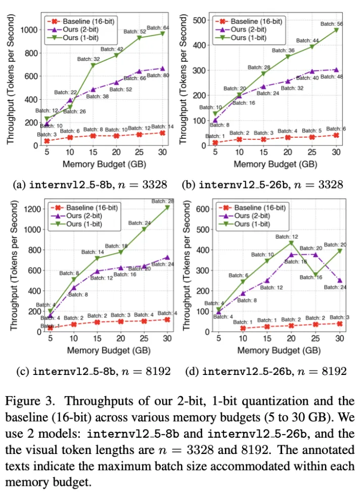 为了展示本文提出的量化方法对解码效率的影响,作者使用 InternVL-2.5 系列模型,将所提出的 1 比特量化方法与 16 比特基线进行了吞吐量评估(即每秒生成的 token 数)。作者考虑了两种视觉 token 长度的情况:n=3328 和 8192。作者将 GPU 最大内存从 5GB 变化到 30GB,并在每种内存限制下,寻找能够容纳的最大 batch size,测量解码阶段的吞吐量。