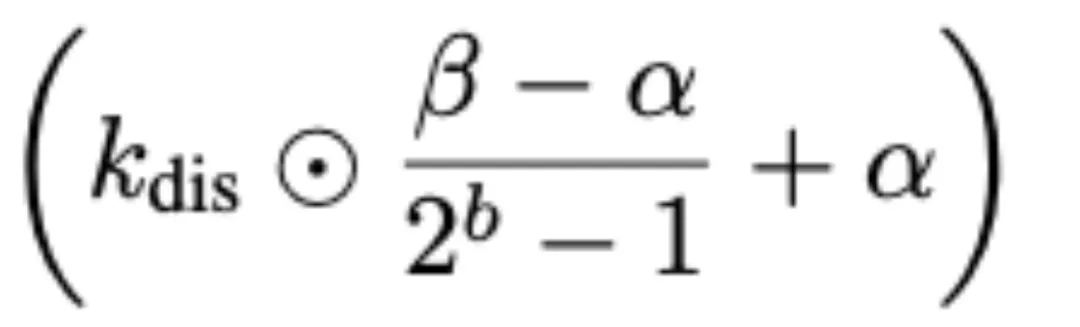 一种广泛使用的方法是均匀整数量化。给定一个比特宽度 b>0 和一个输入值 x,它位于某个范围 [α,β] 内,则将其映射到一个离散整数,计算过程为: