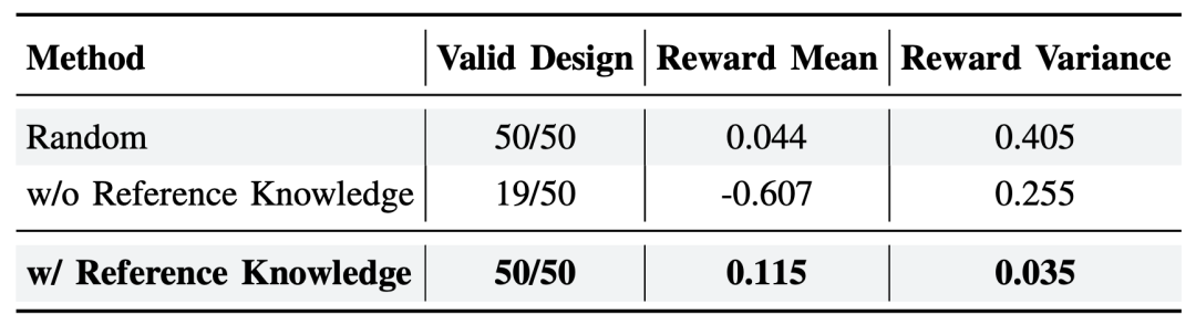 具有参考知识的 LLM 生成的设计全部有效,平均奖励值达 0.115,方差仅为 0.035。