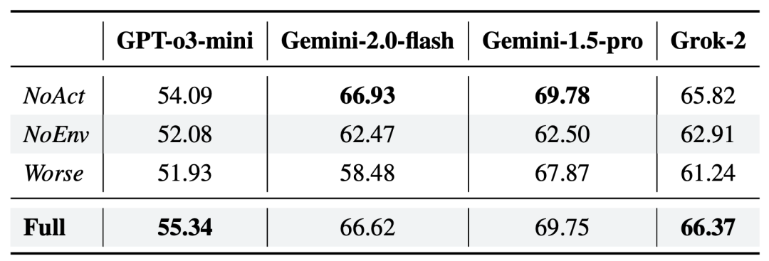 任务描述的重要性:模糊任务描述 (NoEnv) 显著降低了所有模型的性能,例如 GPT-o3-mini 的准确率从 55.34% 降至 52.08%,Gemini-1.5-pro 从 69.75% 降至 62.50%,这强调了任务描述在引导 LLM 决策过程中的重要性。