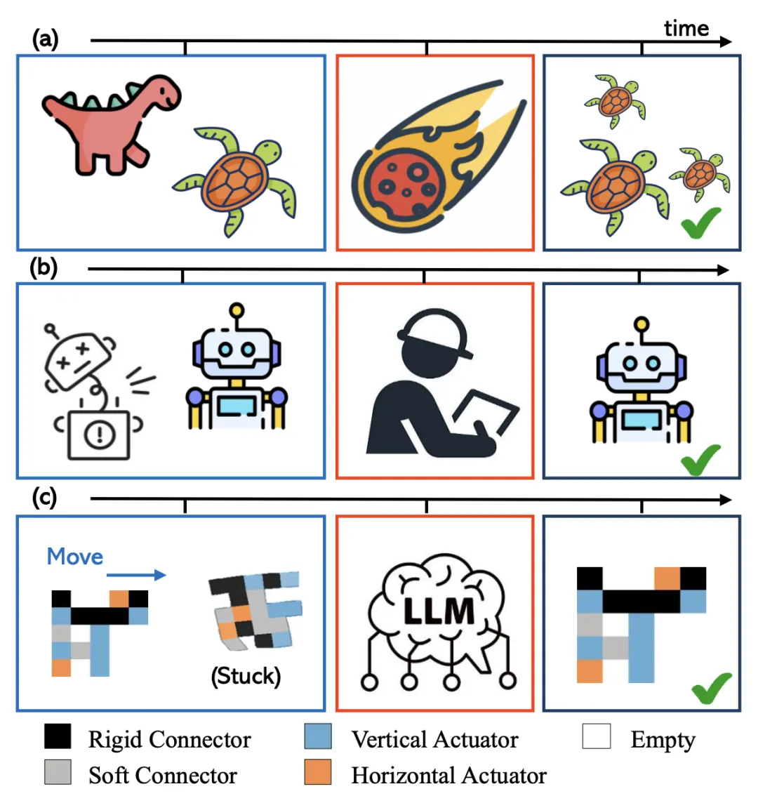 AI 驱动设计:LLM 作为「自然选择器」,利用其庞大的知识库评估和指导软体机器人的设计。