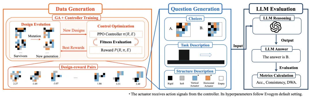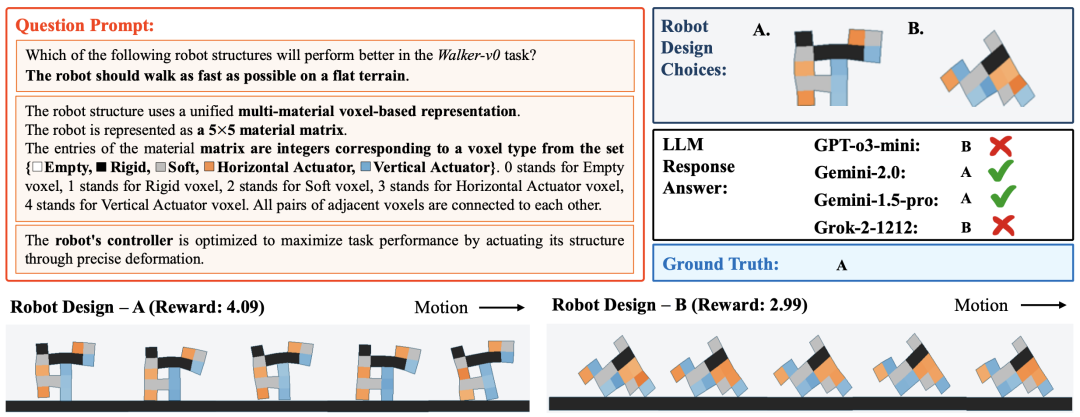 研究团队开发的 RoboCrafter-QA 基准测试专门用于评估多模态 LLM 对软体机器人设计理解的能力。该测试采用问答形式,为 LLM 提供环境描述和任务目标,然后要求模型从两个候选机器人设计中选择性能更佳的一个。