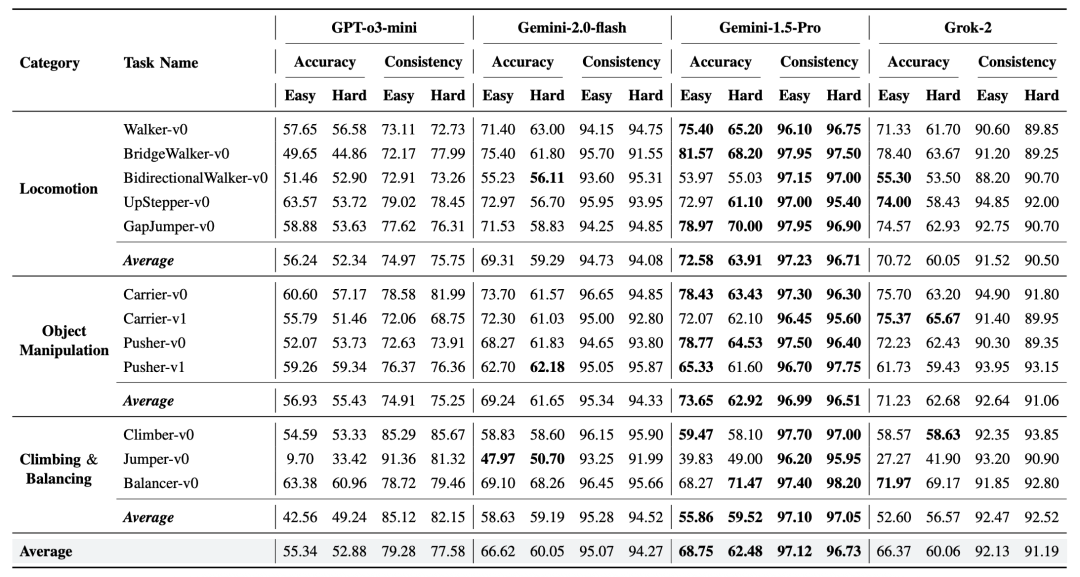 任务难度敏感性:所有模型在更复杂的任务中准确率均有下降,特别是当需要区分细微性能差异的设计时。例如,Gemini-1.5-Pro 在 Walker-v0 任务中,简单级别准确率为 75.40%,困难级别则降至 65.20%。