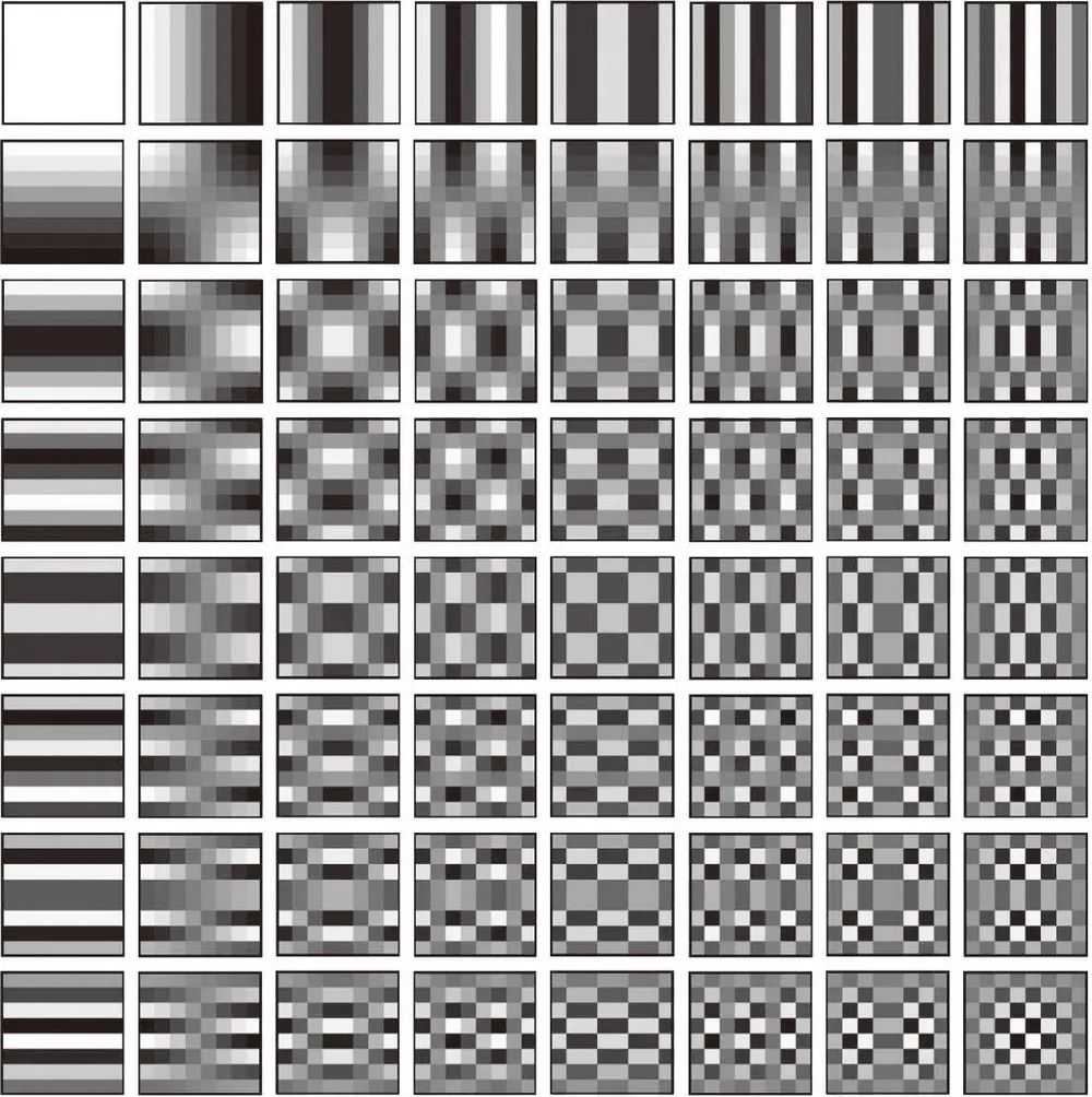 离散余弦变换是傅里叶变换的一种特殊情况,它将图像分解为标准“条纹”图像的叠加。其中一半图像的条纹是水平的,另一半是垂直的。条纹有不同的间隔,就像普通傅里叶变换中的各种谐波一样,其灰度值与余弦曲线非常接近。在块的坐标下,它们是各种整数