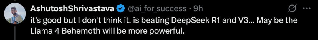 「它很好,但我不认为它在打败 DeepSeek R1 和 V3...也许 Llama 4 Behemoth 会更强大。」