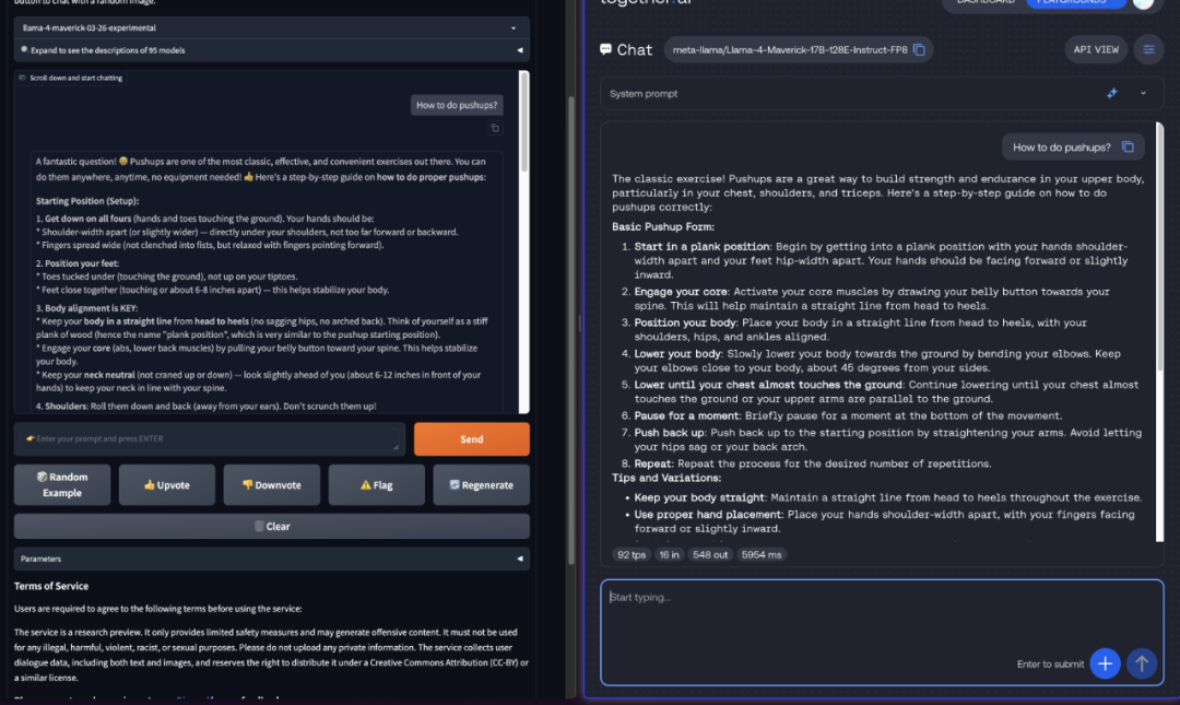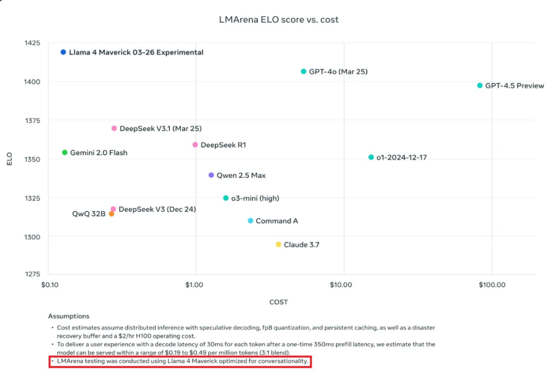 Meta 在公告中提到,LM Arena 上的 Maverick 是「实验性聊天版本」,与此同时官方 Llama 网站上的图表也透露,该测试使用了「针对对话优化的Llama 4 Maverick」。