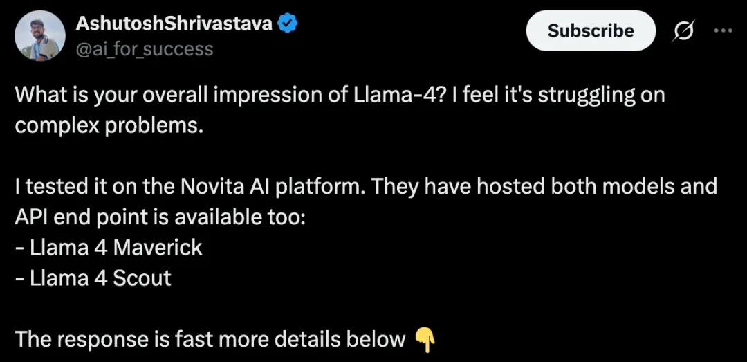 还有网友在 Novita AI 平台上测试了该模型,给出的结论是在复杂问题上有点吃力,但响应速度很快。