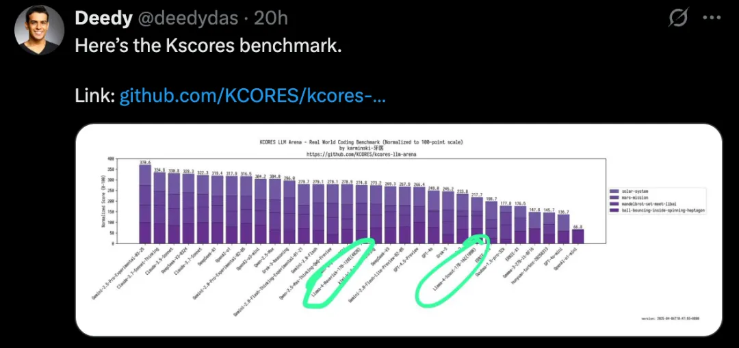 @deedydas 发帖称,Llama 4 Scout(109B)和 Maverick(402B)在 Kscores 基准测试中表现不佳,不如 GPT-4o、Gemini Flash、Grok 3、DeepSeek V3 以及 Sonnet 3.5/7 等模型。而 Kscores 基准测试专注于编程任务,例如代码生成和代码补全。