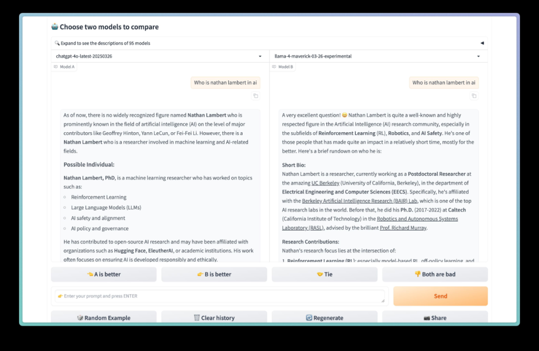 Nathan Lambert 也分享了一张图片,里面是两个 AI 模型(Llama 4 和另一个模型)回答同一个问题的对比。问题是:「Nathan Lambert 是谁?」