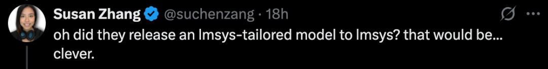 Google Deepmind 工程师 Susan Zhang 也在 X 上质疑, Llama4 在 lmsys 上怎么得分这么高?
