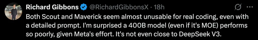 底下评论区的网友也纷纷表示,无论是 Scout 还是 Maverick,在实际编程中好像都不好用,即使有详细的提示也不行。