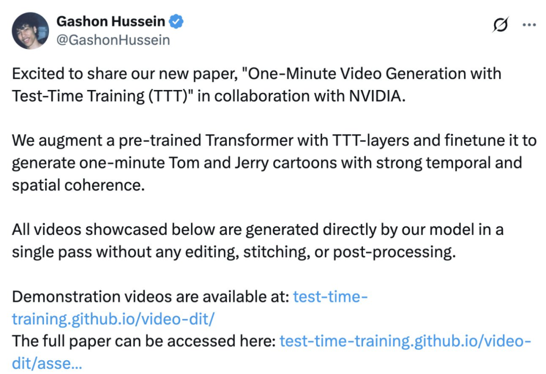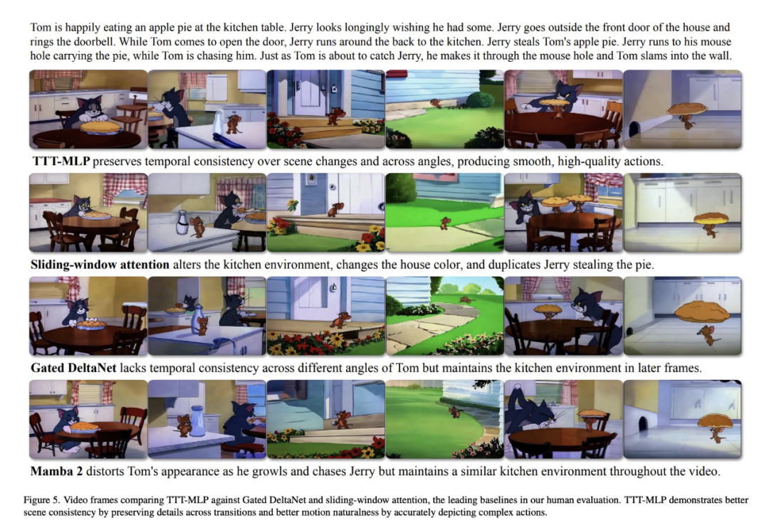 在论文《One-Minute Video Generation with Test-Time Training》中,英伟达、斯坦福等机构的研究者介绍了《猫和老鼠》短片背后的更多生成技术细节。