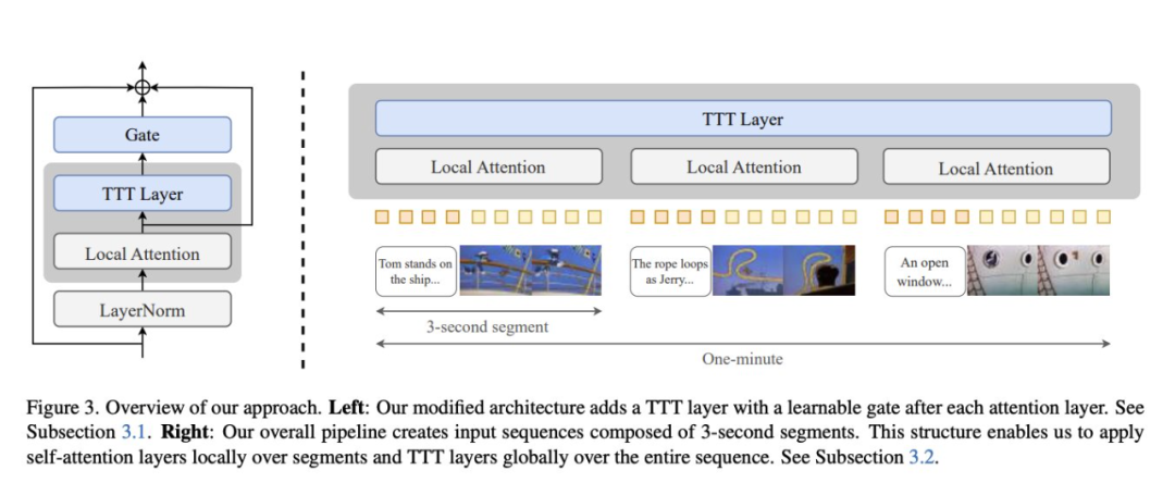 下图 3 为方法概览,其中(左)为本文修改后的架构在每个注意力层后添加一个带有可学习门的 TTT 层,(右)为整体 pipeline 创建了由 3 秒片段组成的输入序列,这种结构允许在片段上局部应用自注意力层,在整个序列上全局应用 TTT 层。