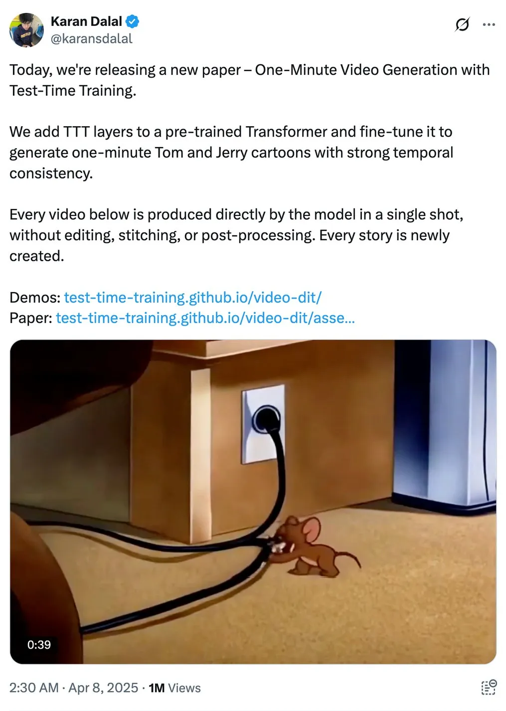 论文共同一作 Karan Dalal 的帖子收获百万观看。